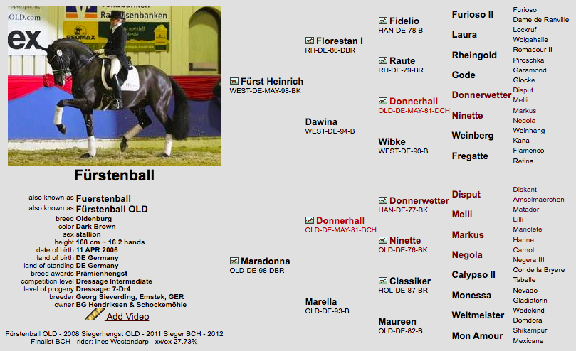 Linia matek prezentuje klasę samą w sobie. Matka Furstenball – Maradonna wywodzi się bezpośrednio od słynnego ogiera Donnerhall, który ma na swoim koncie niezliczoną liczbę wygranych na poziomie klasy Grand Prix. Poza tym może pochwalić się także takimi sukcesami jak wice mistrzostwo w teście ogierów, czy Mistrzostwo Niemiec. Hodowlanie ogier ten plasuje się na czołowych miejscach większości rankingów. Jego potomstwo startuje z powodzeniem w Czempionatach, Mistrzostwach Europy, Świata i Olipmiadach. Łącznie wygrało już ponad milion euro.